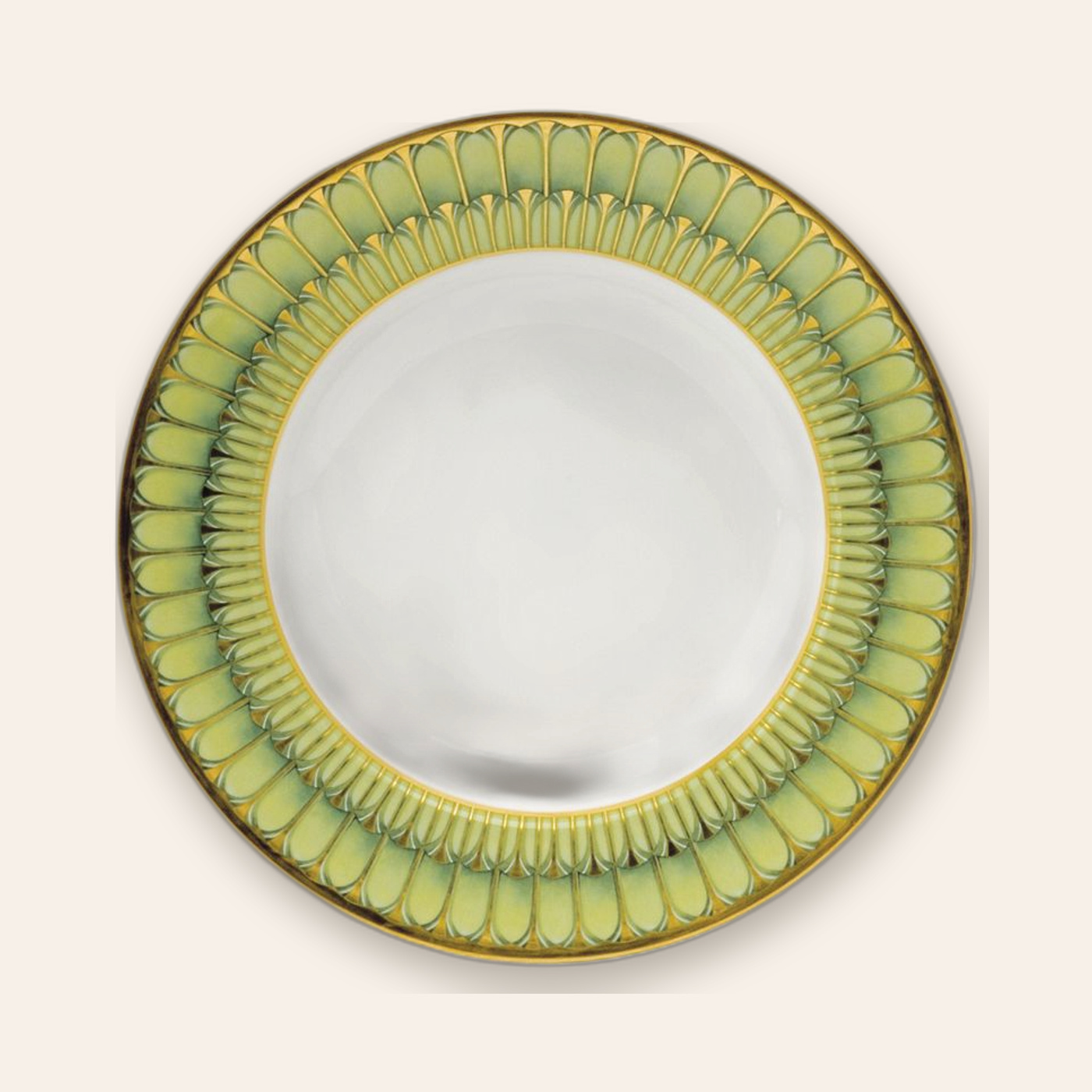 Apportez à votre table une note de luxe français avec cette assiette creuse à aile Arcades vert de Deshoulières, manufacture française de porcelaine reconnue pour son savoir-faire made in France. Son décor vert rythmé de lignes architecturales et souligné d’or révèle une allure sophistiquée sans jamais alourdir le dressage. Parfaite pour les potages, pâtes ou entrées généreuses, elle apporte une présence chic et structurée à la table. Une création fidèle à l’art de vivre français, à la fois élégante, lumineuse et intemporelle.