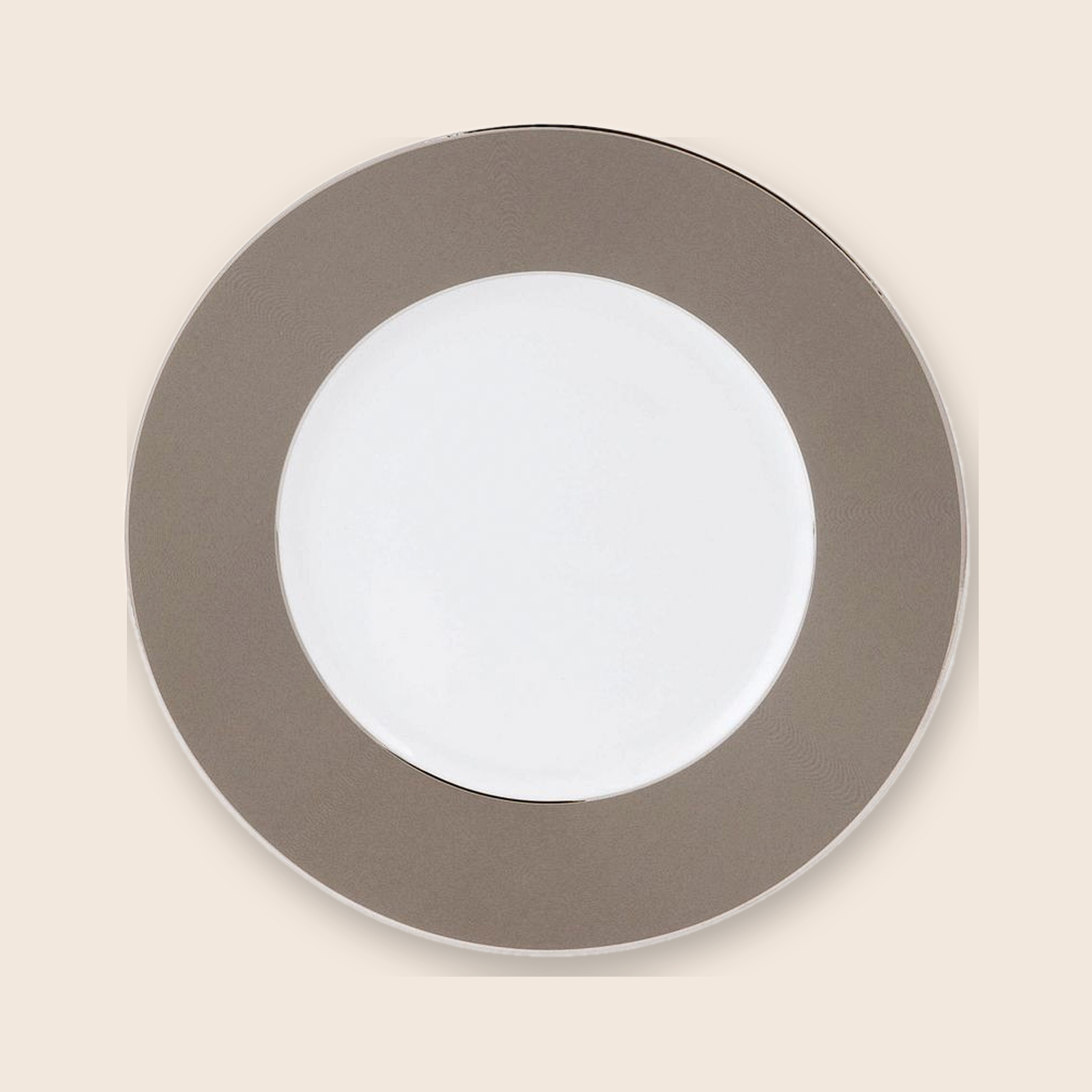 Piece maitresse de la mise en place, cette assiette de presentation metal Deshoulieres de 32 cm impose d emblee un registre ceremoniel. Placee sous chaque assiette de service, elle cadre le dressage avec ampleur et donne a la table une profondeur visuelle immediate. Le metal associe au decor Arcades gris platine produit un eclat miroir saisissant, ou les arceaux gris perle et les lignes argentees se repondent avec une precision quasi architecturale. Un ecrin qui transforme chaque couvert en composition aboutie.