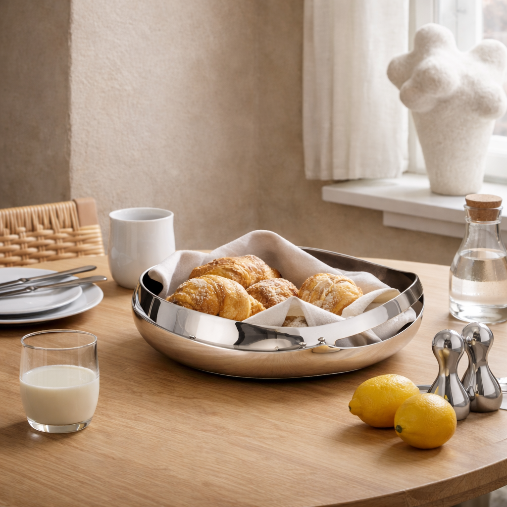 Le panier COBRA de Georg Jensen se distingue par ses courbes iconiques et sa brillance miroir. Sa structure ouverte valorise la présentation des fruits, du pain ou des viennoiseries tout en rendant le service simple et agréable.