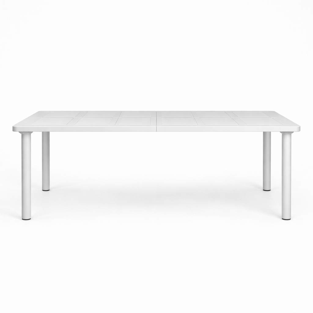 Table à rallonge Libeccio Nardi blanche, pensée pour les repas conviviaux en extérieur. Son design évoque les meubles de jardin classiques tout en conservant une lecture contemporaine, avec un plateau décoré d’un motif perforé délicat. Grâce à son système extensible, elle s’adapte facilement aux besoins du quotidien comme aux grandes tablées. Une solution élégante et pratique pour aménager terrasse, patio ou espace repas extérieur.
