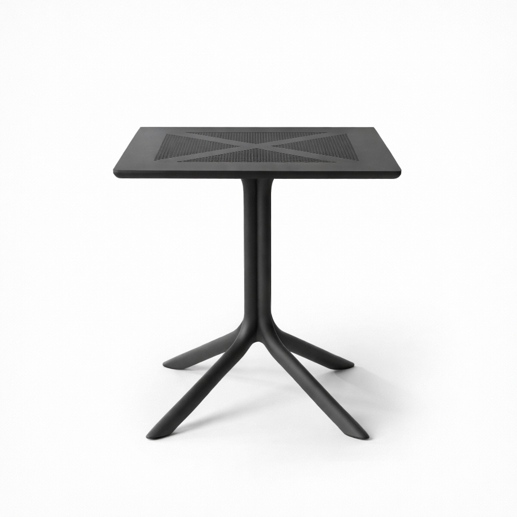 et Livraison au paiementTable carrée Clip Nardi anthracite, parfaite pour composer un coin repas ou détente au style sobre et contemporain. Son plateau présente un motif perforé régulier qui apporte du rythme visuel, tandis que sa forme compacte facilite l’intégration sur balcon, terrasse ou espace professionnel. Sa teinte profonde renforce son caractère moderne. Une table pratique, stable et facile à associer avec différentes assises d’extérieur.