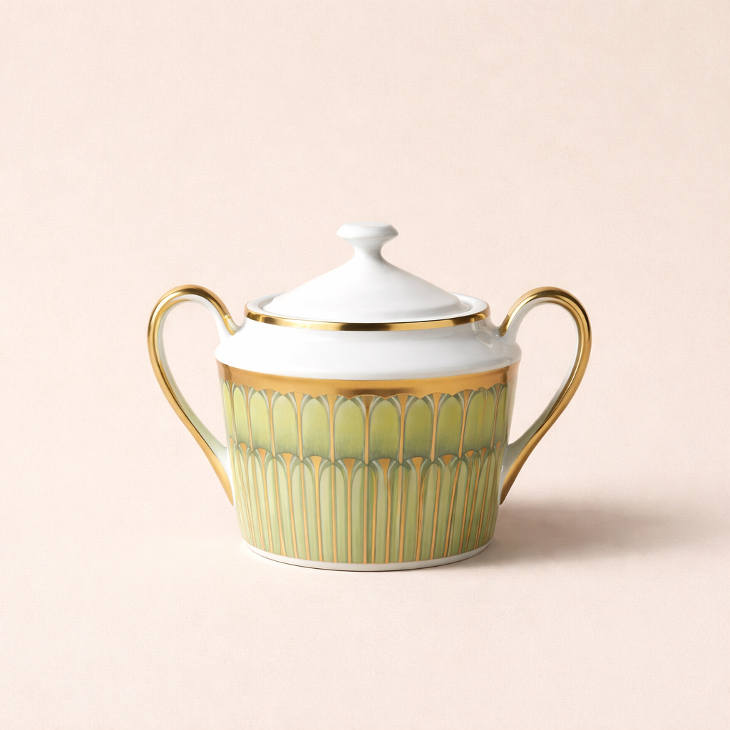 Apportez à votre table une note de luxe français avec ce sucrier Arcades vert de Deshoulières, manufacture française de porcelaine reconnue pour son savoir-faire made in France. Son décor vert rythmé de lignes architecturales et souligné d’or révèle une allure sophistiquée sans jamais alourdir le dressage. Placé entre cafetière et crémier, il complète la scène avec cohérence et élégance. Une création fidèle à l’art de vivre français, à la fois élégante, lumineuse et intemporelle.