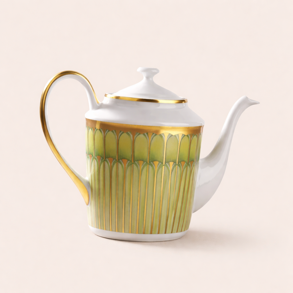 Apportez à votre table une note de luxe français avec cette théière Arcades vert de Deshoulières, manufacture française de porcelaine reconnue pour son savoir-faire made in France. Son décor vert rythmé de lignes architecturales et souligné d’or révèle une allure sophistiquée sans jamais alourdir le dressage. Sa contenance généreuse permet un service du thé aussi pratique que spectaculaire, tandis que sa présence valorise toute la table. Une création fidèle à l’art de vivre français, à la fois élégante, lumineuse et intemporelle.